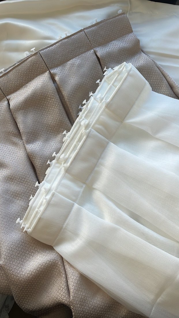 Klasik tarzda, düz desenli beyaz ve gri perdelerden oluşan set. Beyaz perde askı kancalarıyla kolayca asılır.