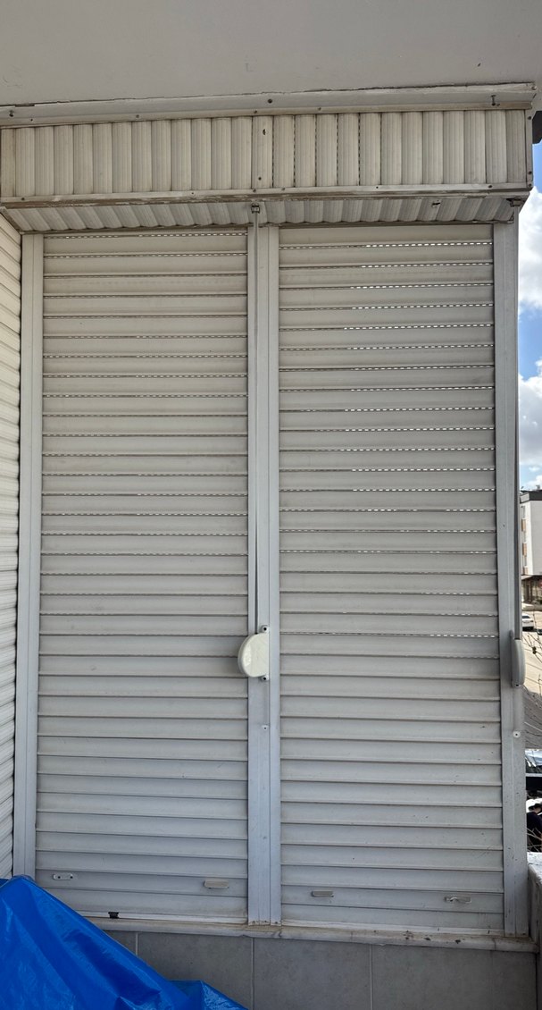 Beyaz ve gri renkte, desensiz ve sade tasarıma sahip stor perde. (PANJUR) PAZARLIK PAYI VARDIR