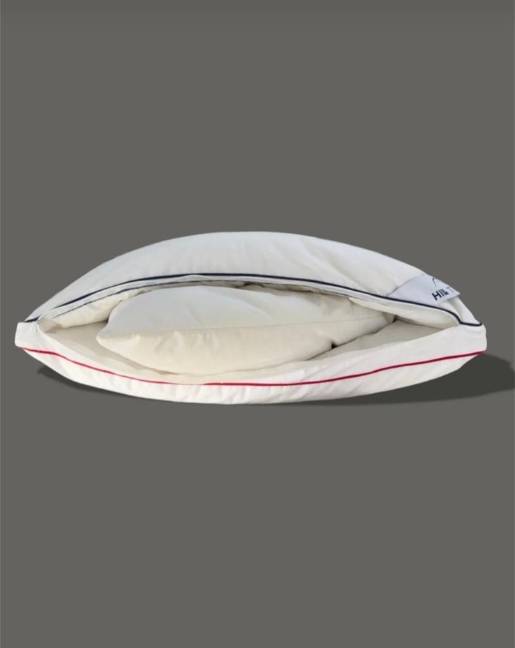 Kenarında ince gri şerit detay bulunan, sade ve düz beyaz yastık. ️