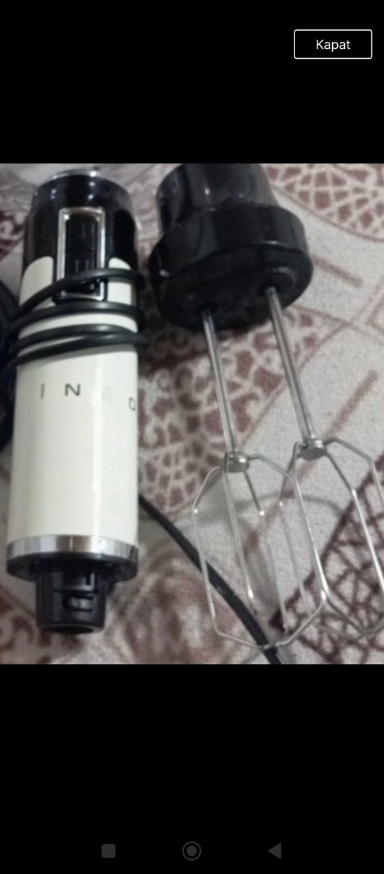 Beyaz ve gri gövdeye sahip, iki metal çırpıcı uçlu el mikseri. Karıştırma ve çırpma işlemleri için uygundur. ⚙️