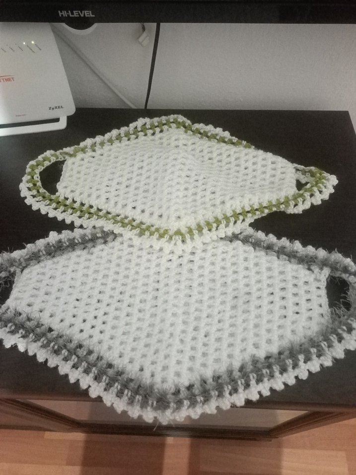 Beyaz renkte, gri ve yeşil kenarlara sahip, yumuşak örgü dokulu, kulplu el yapımı banyo süngerleri.