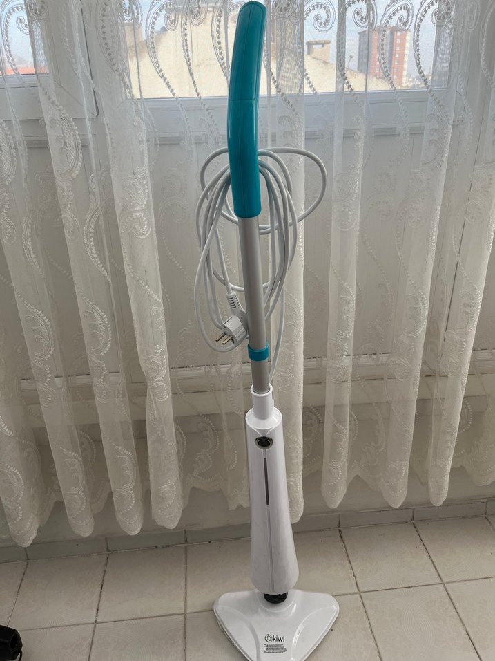 Uzun saplı, beyaz ve gri renkli elektrikli buhar Makınesi kolay saklama için kabloya sahip. Zemin temizliği için uygundur.