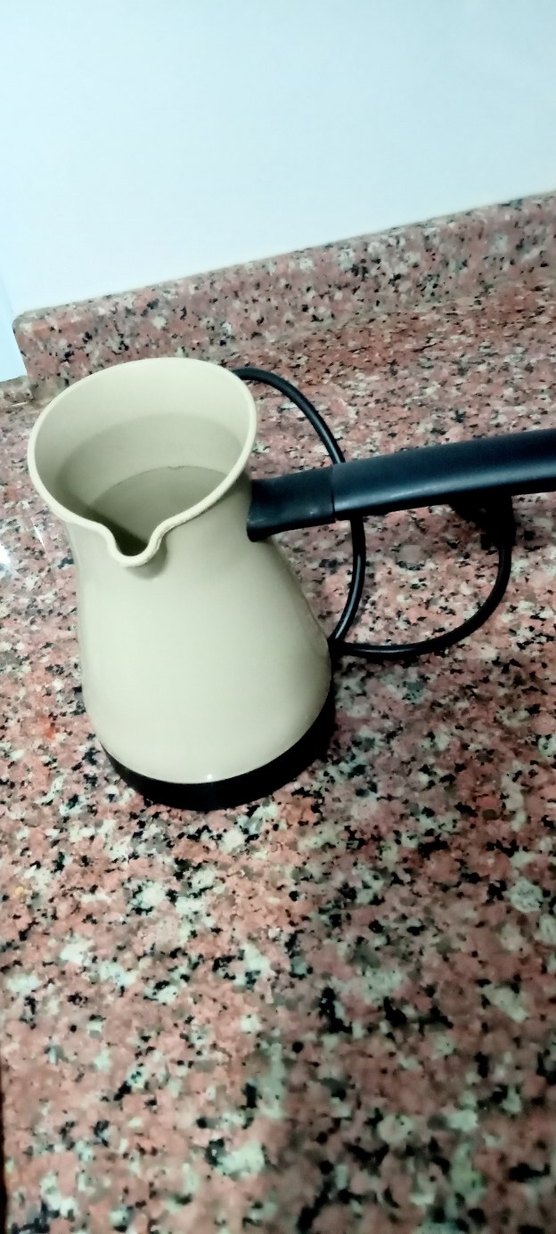 Beyaz ve gri renkte, siyah saplı elektrikli cezve, çok az kullandım kendime daha büyük aldığın için satıyorum iade kabul etmiyorum bilginize