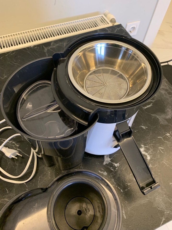 Paslanmaz çelik süzgeçli, kolay dökme kolu bulunan beyaz ve gri elektrikli meyve sıkacağı. Şeffaf kapak ve kablo dahil.