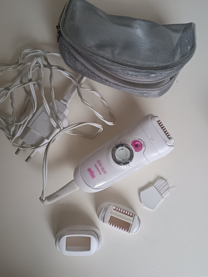 Beyaz ve gri renklerde, çoklu başlıklar ve taşıma çantası ile epilatör seti. Güç kablosu ve temizlik fırçası dahildir. ✨