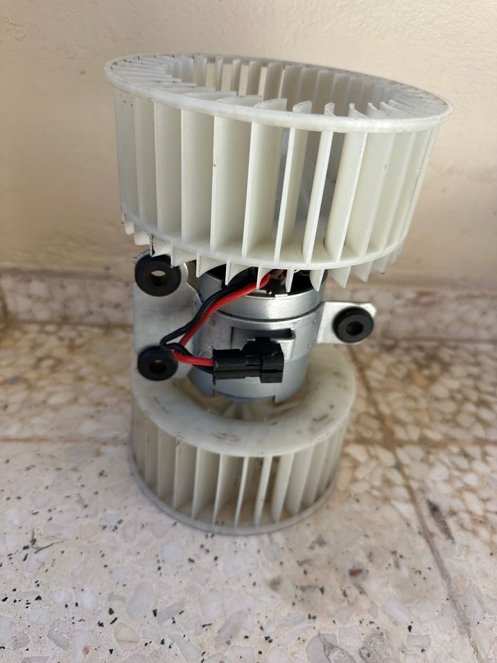 Elektrik bağlantılı, çift fan kanatlı beyaz ve gri fan motoru. ⚙️