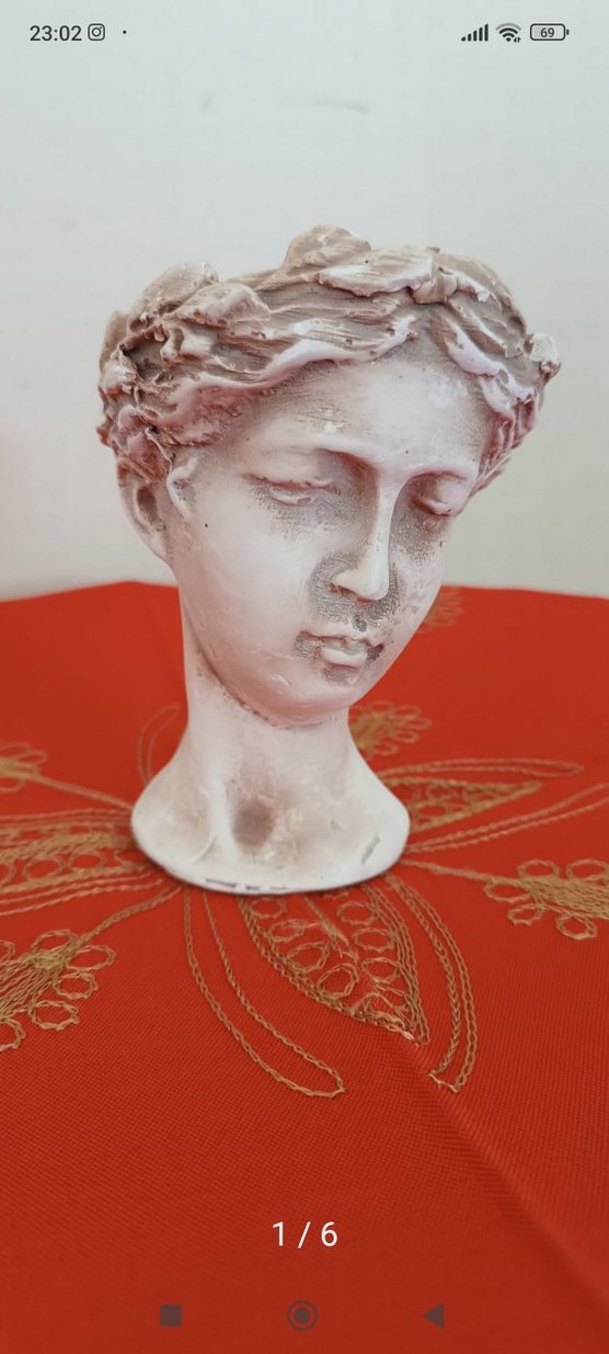 Detaylı yüz hatlarına ve dokulu saça sahip beyaz ve gri figürin baş heykeli, dekorasyon için uygundur. eskilerden seramik 14*10 cm ebatlarında obje saksı, takı koyma, sunumluk, mumluk ya da biblo olarak kullanılabilir.her yeri gösterilmektedir.detaylar görsellerde mevcut. görselleri inceleyerek açıklamaları okuyunuz lütfen. emin değilseniz alım yapmayınız. iptal iade yok.