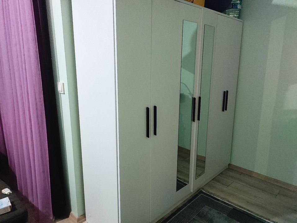 Siyah kulplu, bir kapısında tam boy ayna bulunan beyaz ve gri gardırop. Çocuk kıyafetleri için geniş depolama alanı sunar. Yetişkinler içinde kullanılabilir ben kendim için kullanıyorum 180/180 ölçüsü.Nakli ve kurulum alıcıya aittir