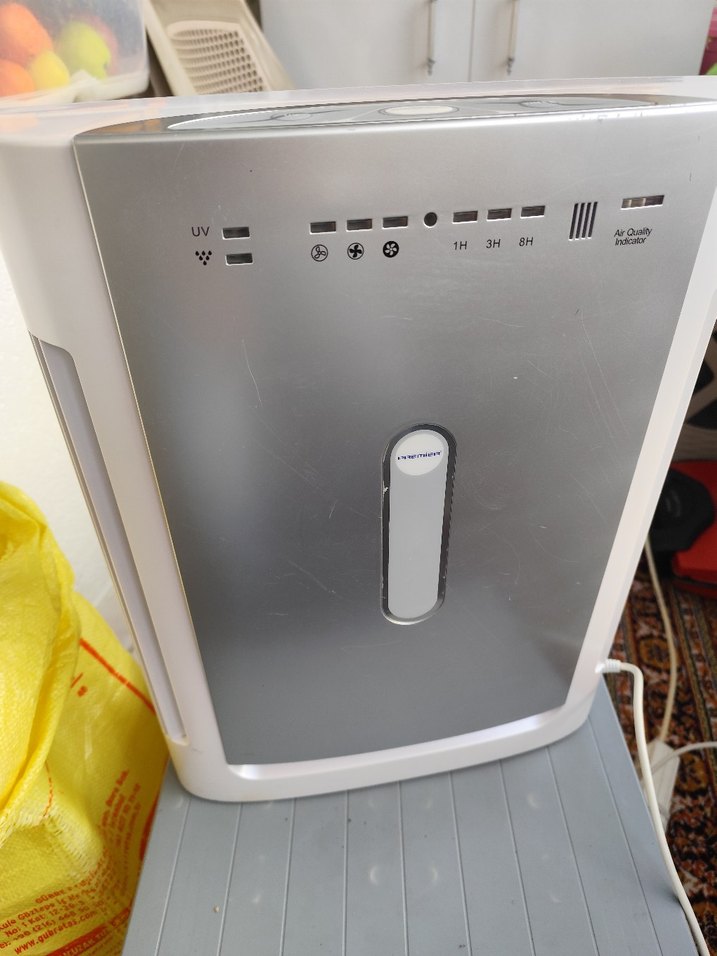 UV sterilizasyonlu, zaman ayarlı ve hava kalitesi göstergeli beyaz ve gri hava temizleyici ve nemlendirici.