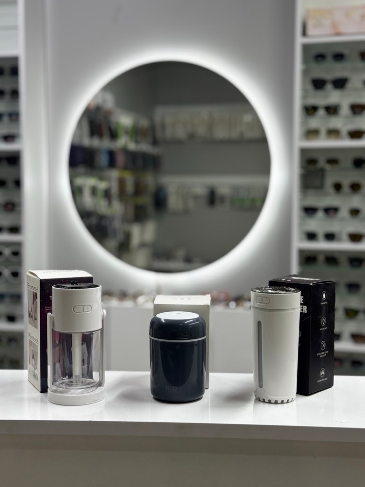 Beyaz ve gri renklerde, iç mekan havasını temizleyen ve nemlendiren kompakt cihazlar. ️