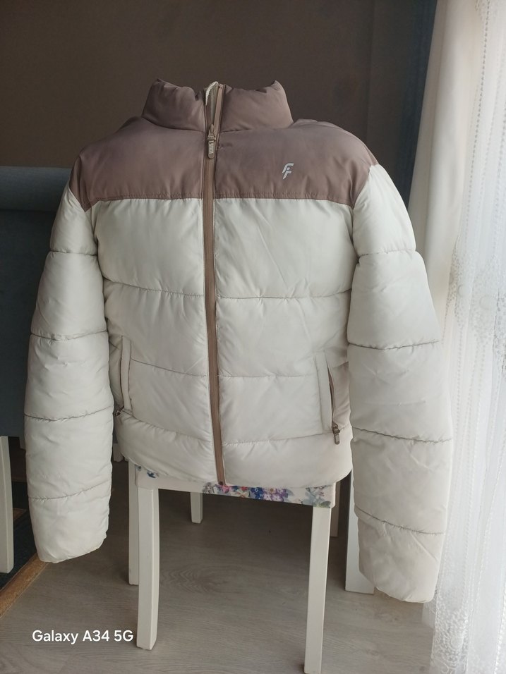 Yüksek yakalı, fermuarlı, beyaz ve gri tonlarında şişme kadın kışlık mont. İnce kesim, uzun kollu ve midi boy, rahat sokak stili için uygun. defakto dan alındı bayagı sıcak tutuyor durdukça bazı yerinde leke var silinmesi gerek