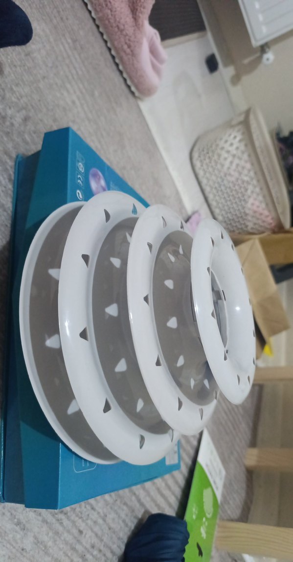 Küçük kesiklere sahip beyaz ve gri renkli dairesel kedi oyuncak diski, kediler için etkileşimli oyun sağlar.