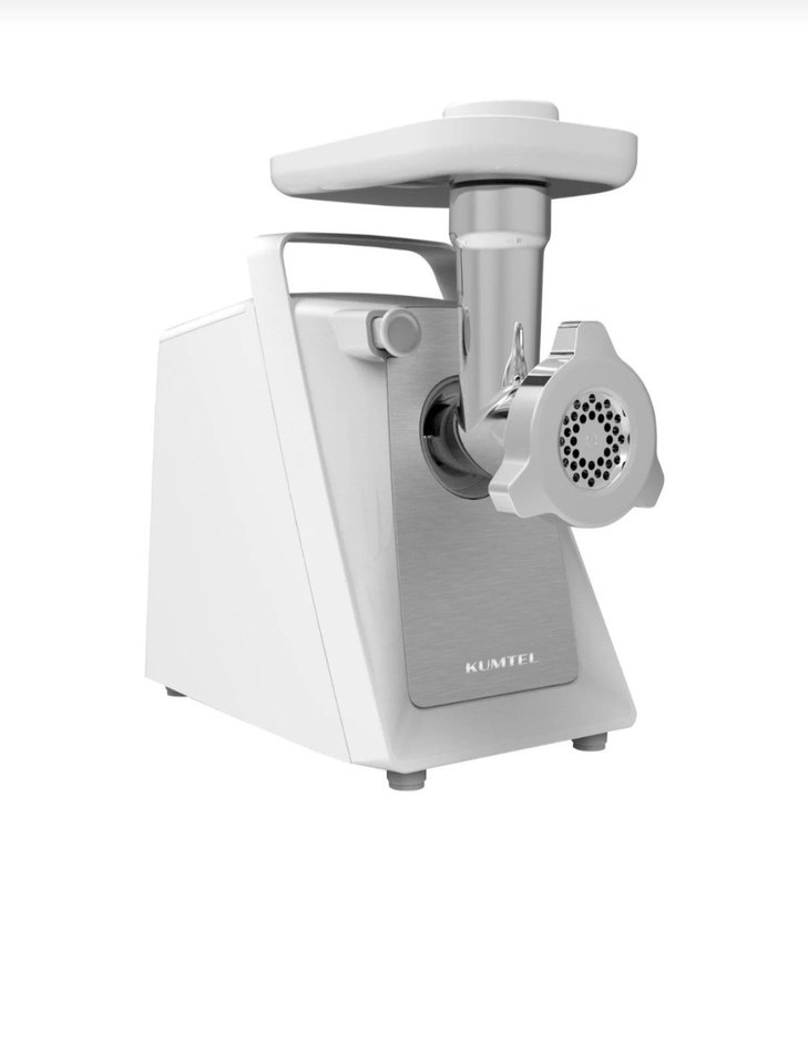 Kumtei markalı beyaz ve gri kıyma makinesi, sağlam yapısıyla mutfağınızda et öğütme işlemi için uygundur.