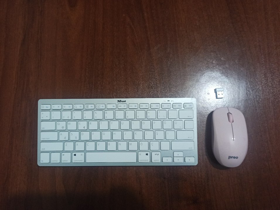 Beyaz ve gri klavye ve mouse Bluetooth bağlantılı