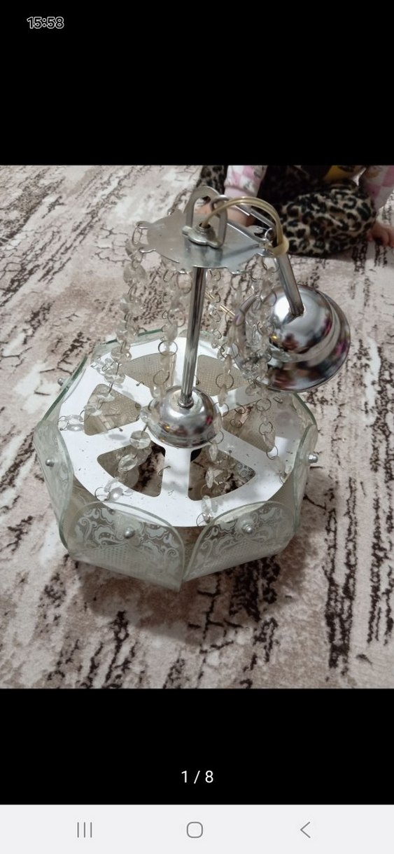 Beyaz ve gri renkte, kristal görünümlü süslemeleri ve metal yapısıyla dekoratif tavan lambası. avize hiç takılmadı