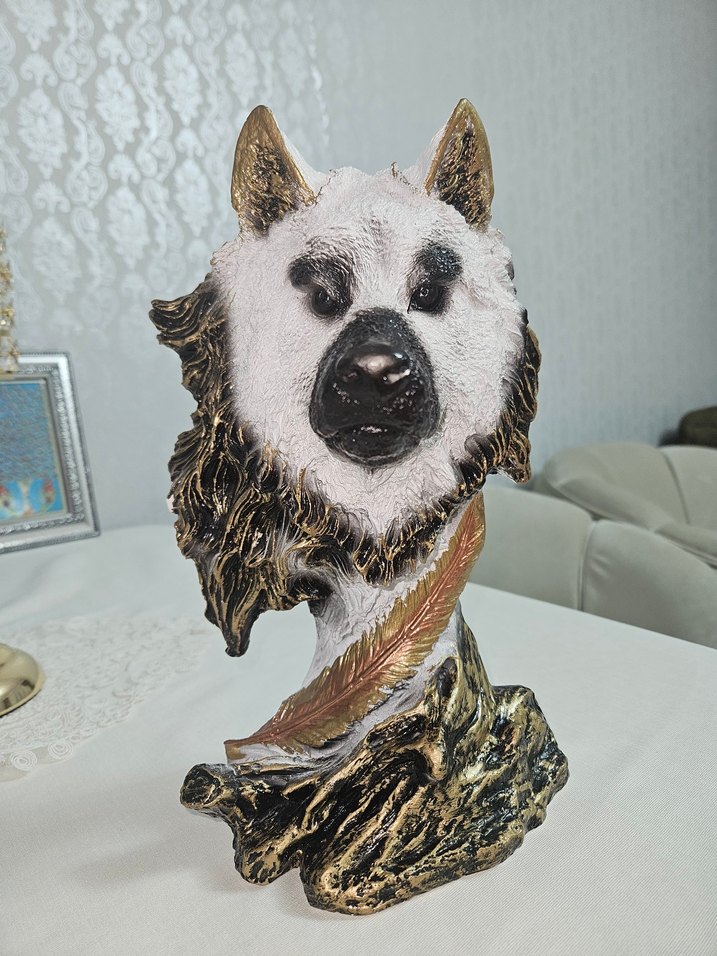 Bu figür, beyaz ve gri tonlarda kurt başı ve detaylı kürk dokusuna sahip, dekoratif tabanlıdır.