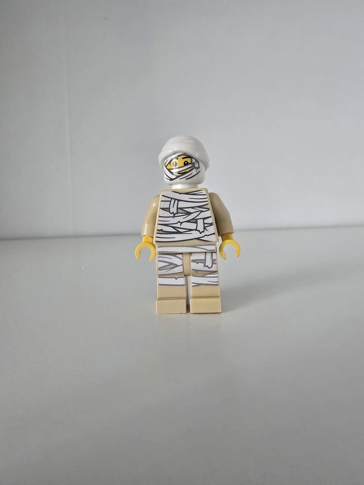 Bu Lego figürü, beyaz ve gri bandajlarla sarılmış mumya şeklindedir, sarı yüzüyle dikkat çeker.