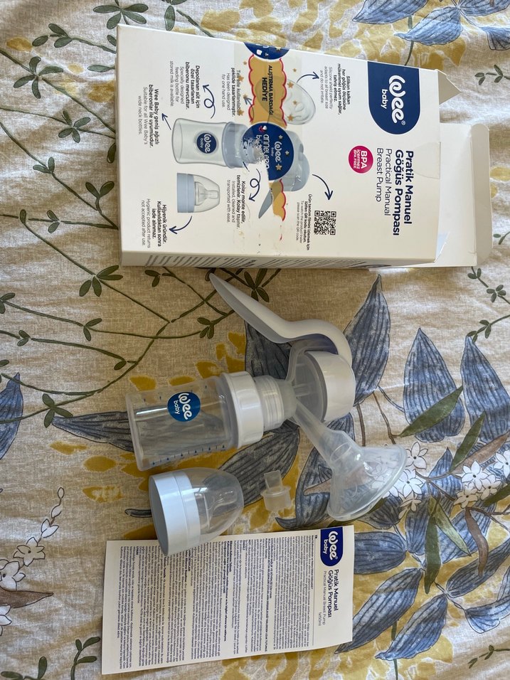 Gri ve beyaz renkli manuel göğüs pompası, şişe ve emzik aparatı ile birlikte. Kutusu ve kullanım talimatları mevcuttur.