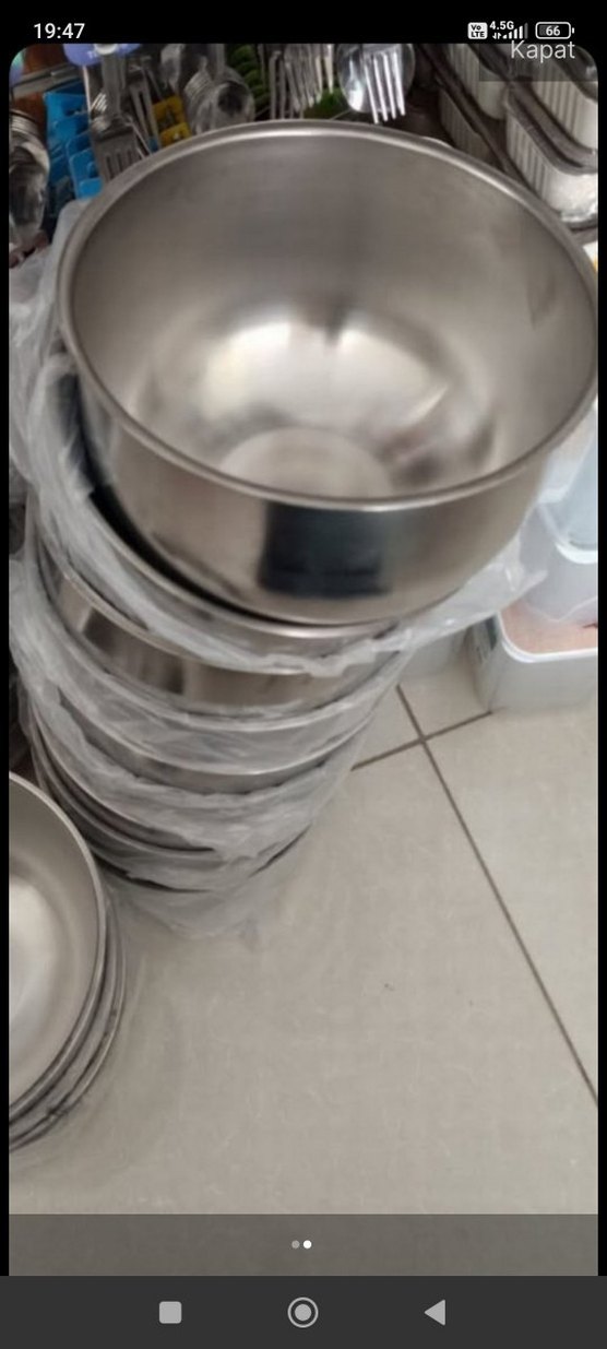 Çeşitli mutfak işleri için beyaz ve gri metal kase . Dayanıklı ve temizlemesi kolay.