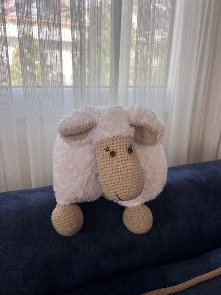 Beyaz ve gri renklerde, örgü yüz ve ayaklara sahip yumuşak ve sevimli koyun peluş oyuncak. Yastığa dönüşür. El emeğidir hiç kullanılmadı