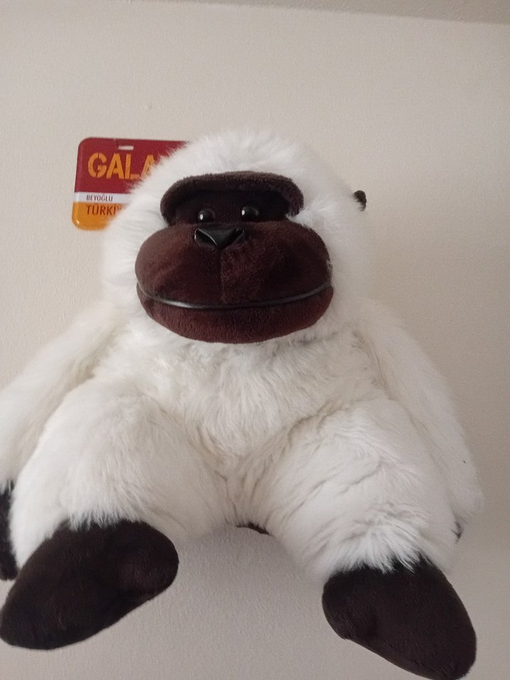 Yumuşak beyaz ve gri peluş goril oyuncak, detaylı yüz özelliklerine sahip ve üzerinde 'GAL' etiketi bulunuyor.
