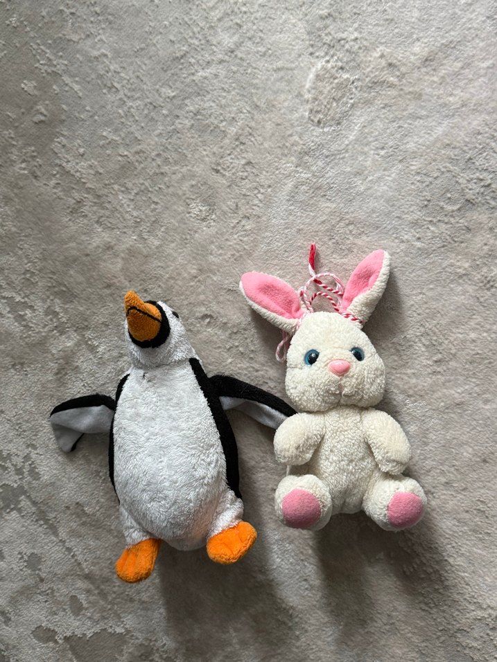 Pembe kulaklı beyaz tavşan ve turuncu ayaklı gri penguen peluş oyuncaklar. Yumuşak dokulu ve sevimli detaylara sahip. Defo mevcut görselde anlaşılıyor