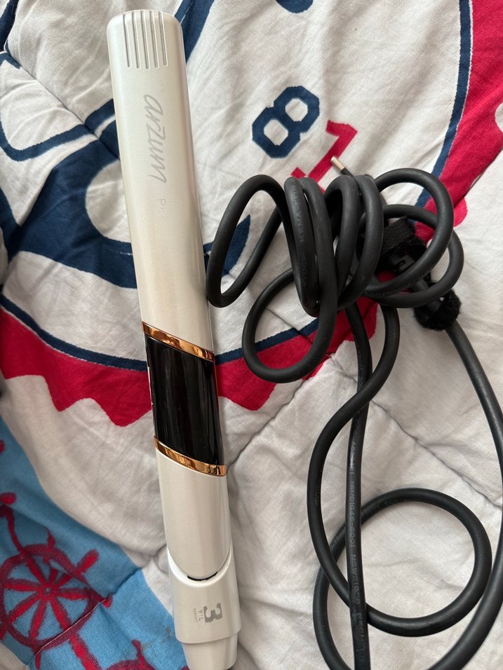 Beyaz ve gri renkli, siyah detaylı saç düzleştirici, uzun kablosu ile kullanımı kolay ve taşınabilir. ♀️