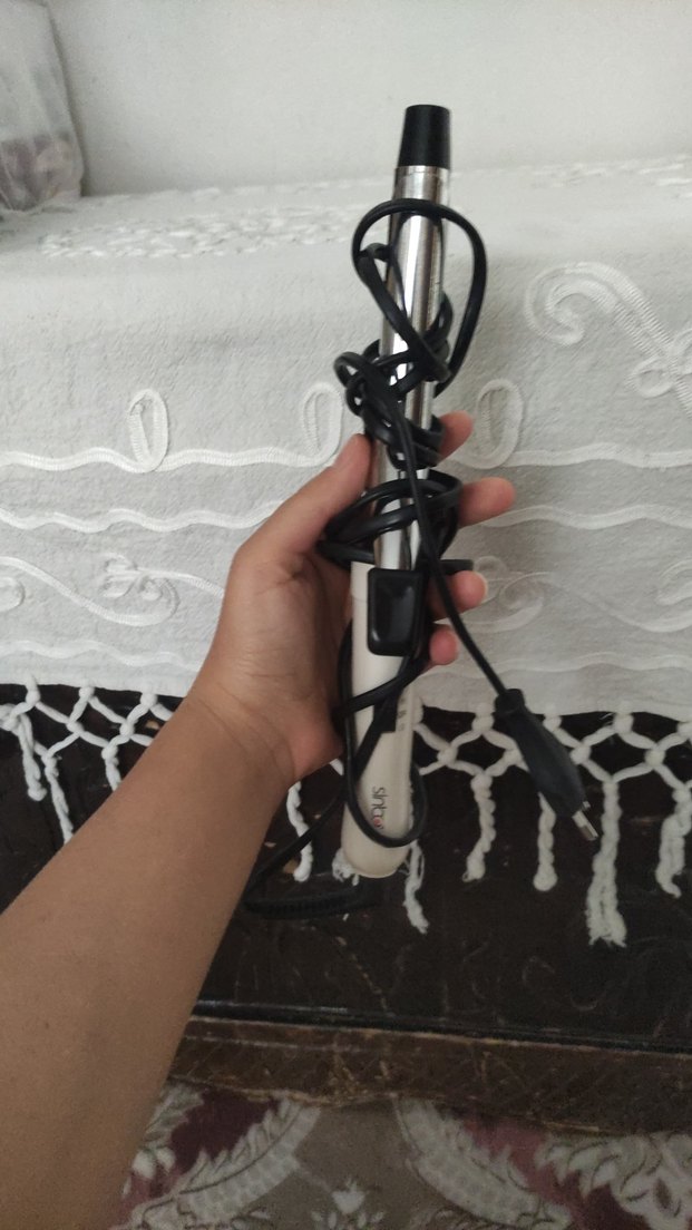 Uzun kablolu beyaz ve gri saç şekillendirici, saçları kıvırmak ve şekillendirmek için kullanılır.