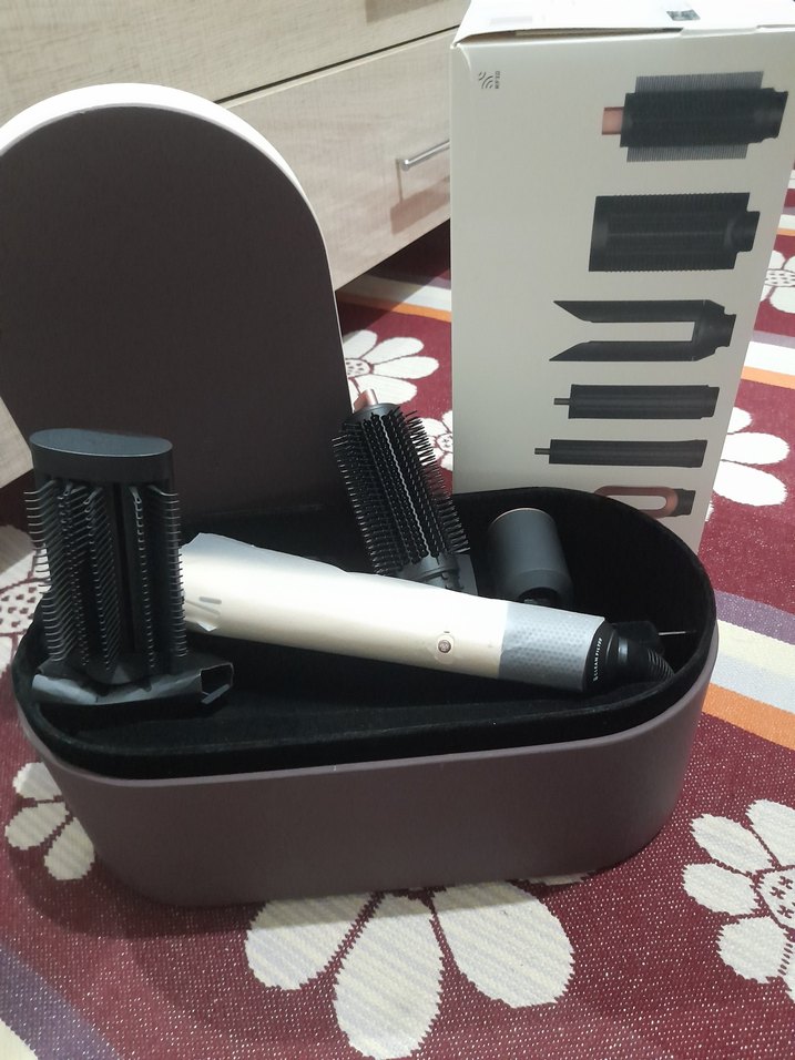 Beyaz ve gri ana cihaz ile çeşitli fırça başlıkları ve saklama kutusundan oluşan saç şekillendirici set. ♀️