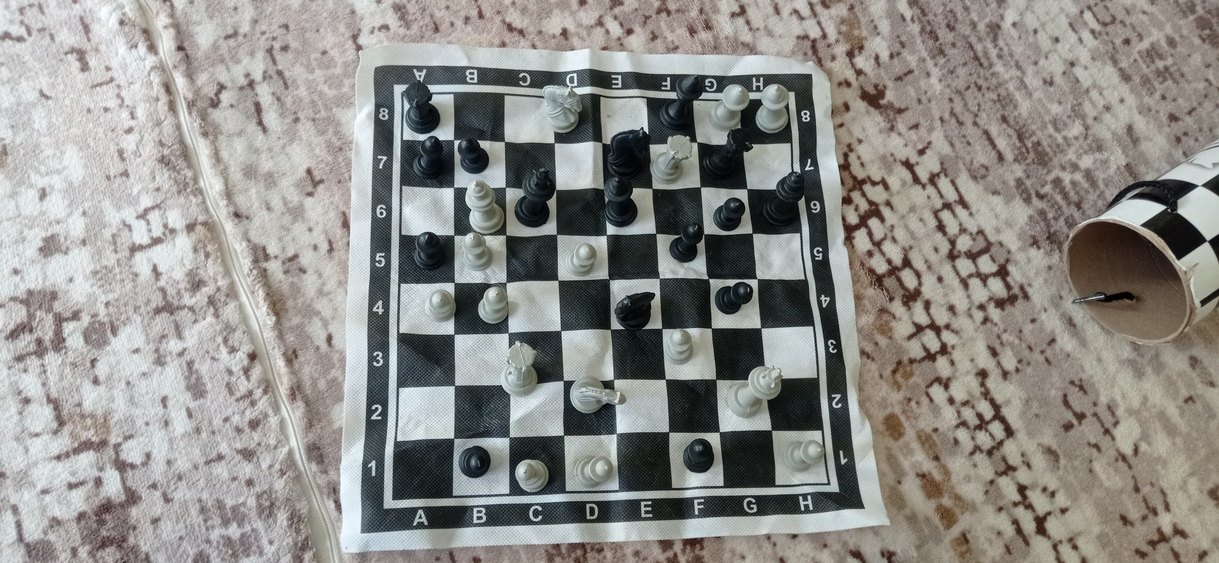 Beyaz ve gri taşlara sahip satranç takımı, üzerindeki kareli tahtada harfli satırlar bulunur. ♟️