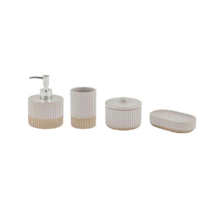 Beyaz ve gri tonlarda seramikten yapılmış, sabunluk, diş fırçalık, kapaklı kavanoz ve sabunluk içeren banyo seti.