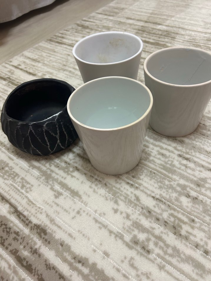 Beyaz ve gri tonlarda, düz ve desenli yüzeylere sahip seramik vazo seti, dekoratif kullanım için uygundur. Görsellerde görüldüğü gibidir. 12-15 cm çapındalar.