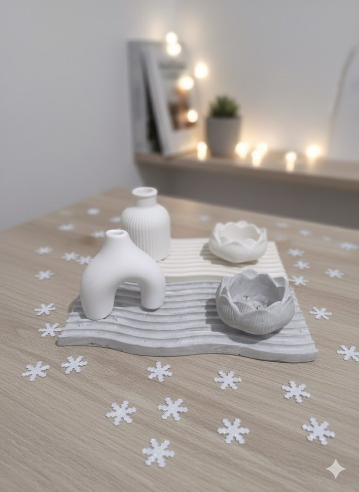 Beyaz ve gri renklerde, farklı tasarımlara sahip seramik vazolar, dokulu bir örtü üzerinde sergileniyor.