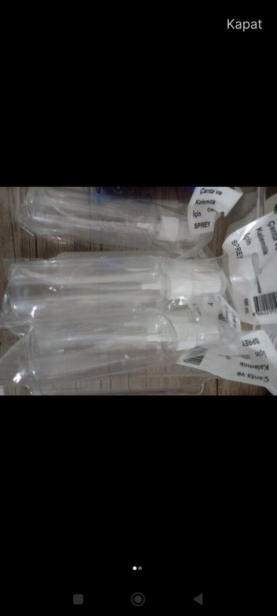 Beyaz ve gri renklerde, SPREY yazılı püskürtme başlıklı şeffaf şişe. Kolay kullanım ve kontrollü sprey sağlar. ️