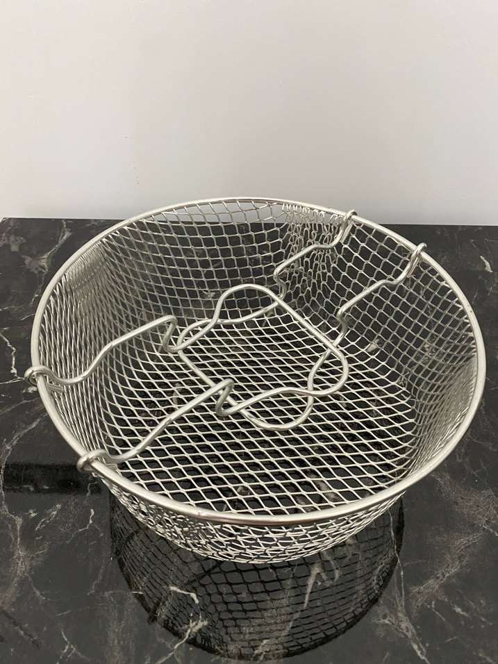 Beyaz ve gri renklerde, tel örgü yapısına sahip, saplı kızartma ve ızgara sepeti. Marka temsili