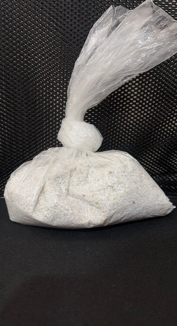Şeffaf plastik torbada beyaz ve gri toz karışımı, ince ve taneli yapıda.