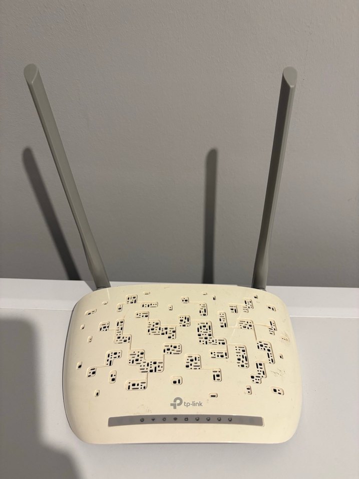 İki antenli beyaz ve gri TP-Link kablosuz router. Üst yüzeyde delikli desen ve gösterge ışıkları bulunur kabloları da vardır.