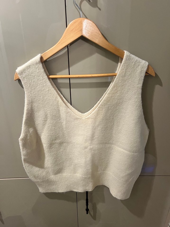 Beyaz, V yakalı, örgü yün kumaştan, kol kısmı kolsuz, bol kesim ve normal uzunlukta kadın süveteri. Rahat ve şık bir sokak stili parçası.