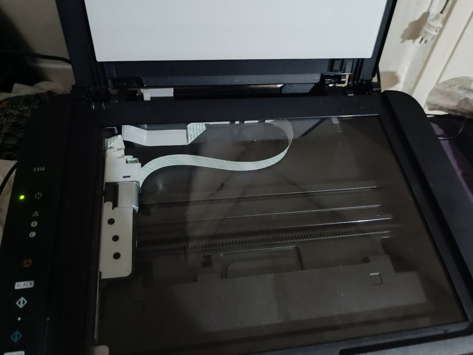 Beyaz ve gri renkte, şeffaf tarama yüzeyi ve şerit kablo bağlantısına sahip yazıcı. ️ürün böyle sağlam sorunsuz çalışıyor onun dışında pek fazla bilgiye sahip değilim