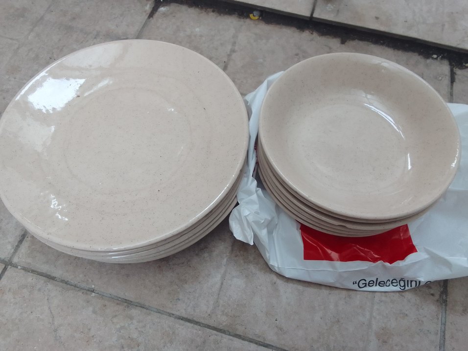 Beyaz ve gri renklerde, sade ve düzgün tasarımlı yemek tabakları seti. ️ bazılarında atık var yüksek kalite