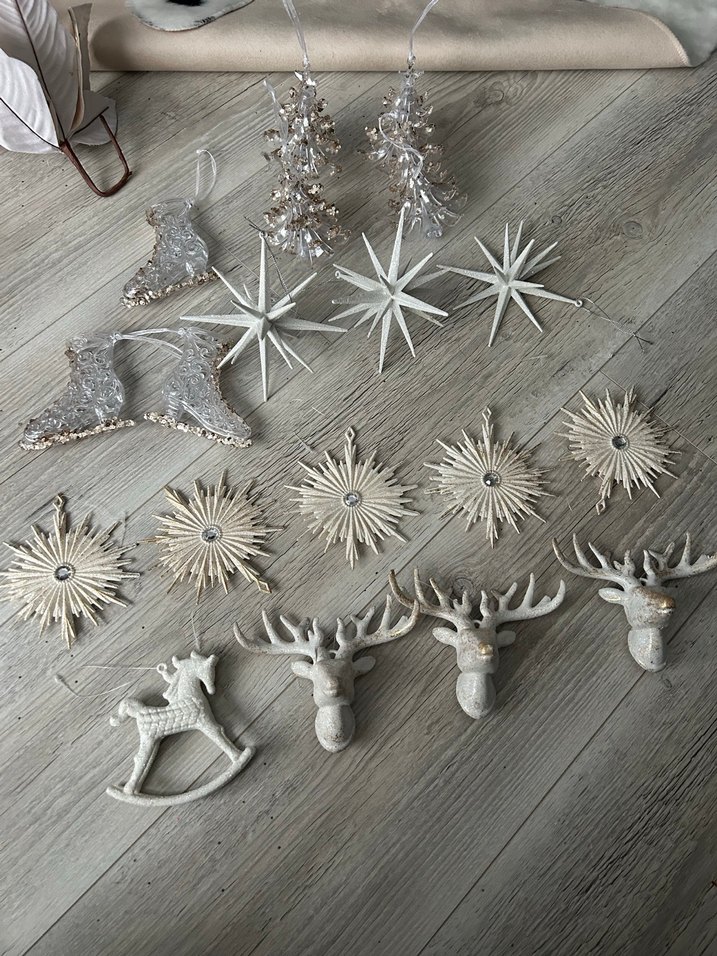 Yıldız, geyik başı, buz pateni ve sallanan at figürlerinden oluşan beyaz ve gri yeni yıl süsleri seti. ❄️