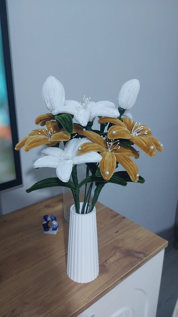 Yüksek beyaz vazoda beyaz ve hardal kadife çiçeklerin bulunduğu dekoratif aranjman. Yumuşak kadife dokusu ortamı sıcak kılar.
