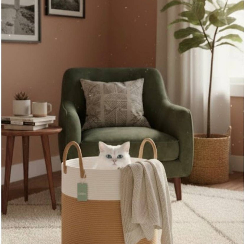 Saplı, beyaz ve kahverengi pastel tonlarda saklama sepeti. Yumuşak kumaş dokusuyla eşyalarınızı düzenlemek için uygundur.