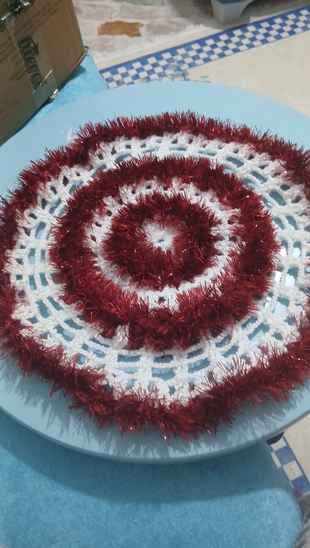 Beyaz ve kırmızı tüylü iplikten oluşan yuvarlak bohem tarzda el örgüsü lif