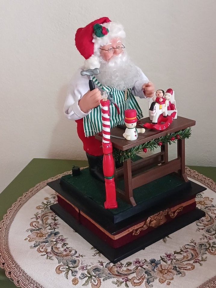 Kırmızı şapkalı ve çizgili önlüklü Noel Baba figürü, küçük oyuncaklar ve süslerle dolu tahta masa arkasında duruyor. Alt taban koyu renkli ve süslemelidir. BİLGİ ALMAK İÇİN YAZIN LÜTFEN