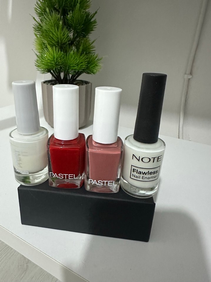 Note ve Pastel markalarından beyaz, kırmızı ve nude tonlarda açık renkli oje seti. 4 adettir. Hiç kullanılmamış sıfır üründür.✨