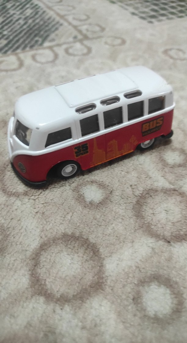 Beyaz tavan ve kırmızı alt kısmıyla renkli tasarıma sahip oyuncak minibüs. Detaylı cam ve tekerlekleri bulunur.