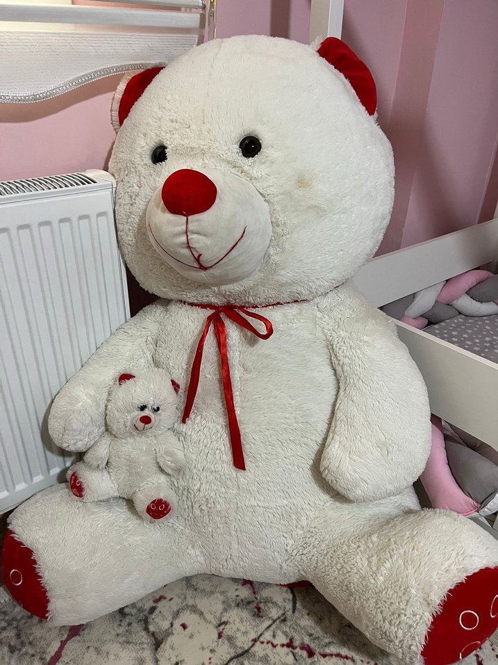 Yumuşak beyaz peluş ayı oyuncağı, kırmızı kulak, burun, pati ve boyun bağı detaylarıyla. Küçük eşleşen ayı ile birlikte.