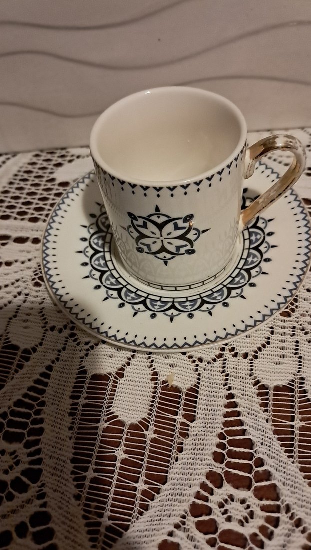 Beyaz kahve fincanı koyu detaylı desenle birlikte servis tabağı ile birlikte sunulur. ☕