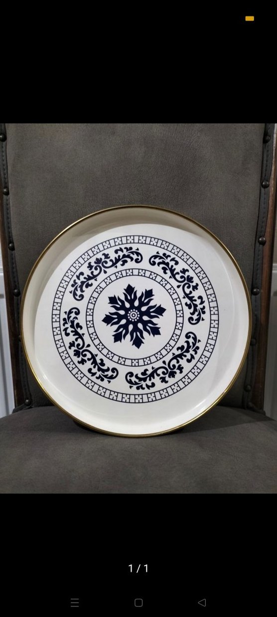 Altın rengi kenarlıklı, beyaz zemin üzerine koyu desenli yuvarlak tepsi, servis veya sunum için uygundur. ️